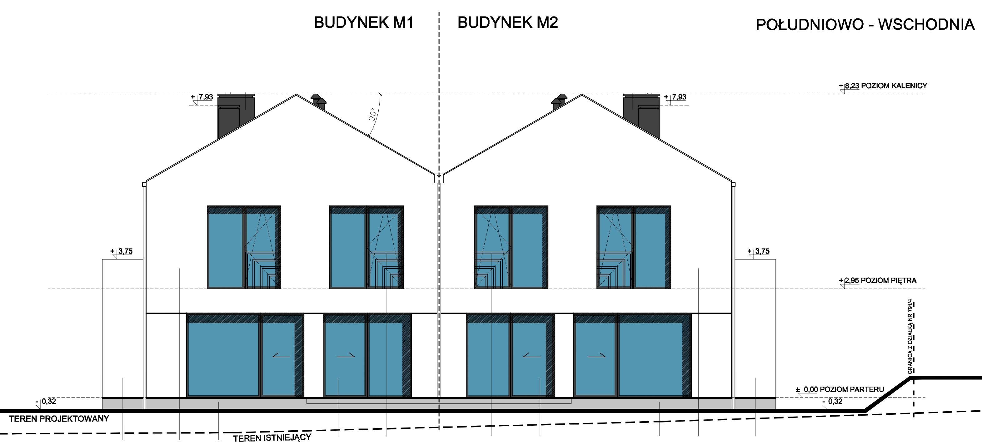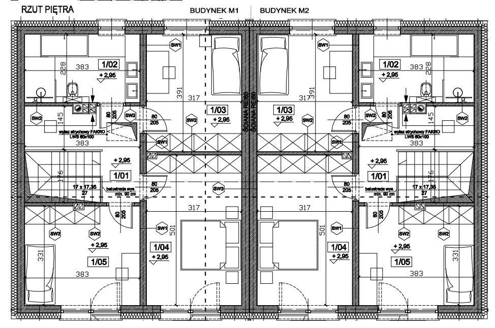 Każdy budynek składa się z dwóch lokali mieszkalnych o łącznej powierzchni użytkowo-mieszkalnej 249,46m2 - łącznie 748,38 m2. Do każdego lokalu mieszkalnego przynależy około 410m2 działki.