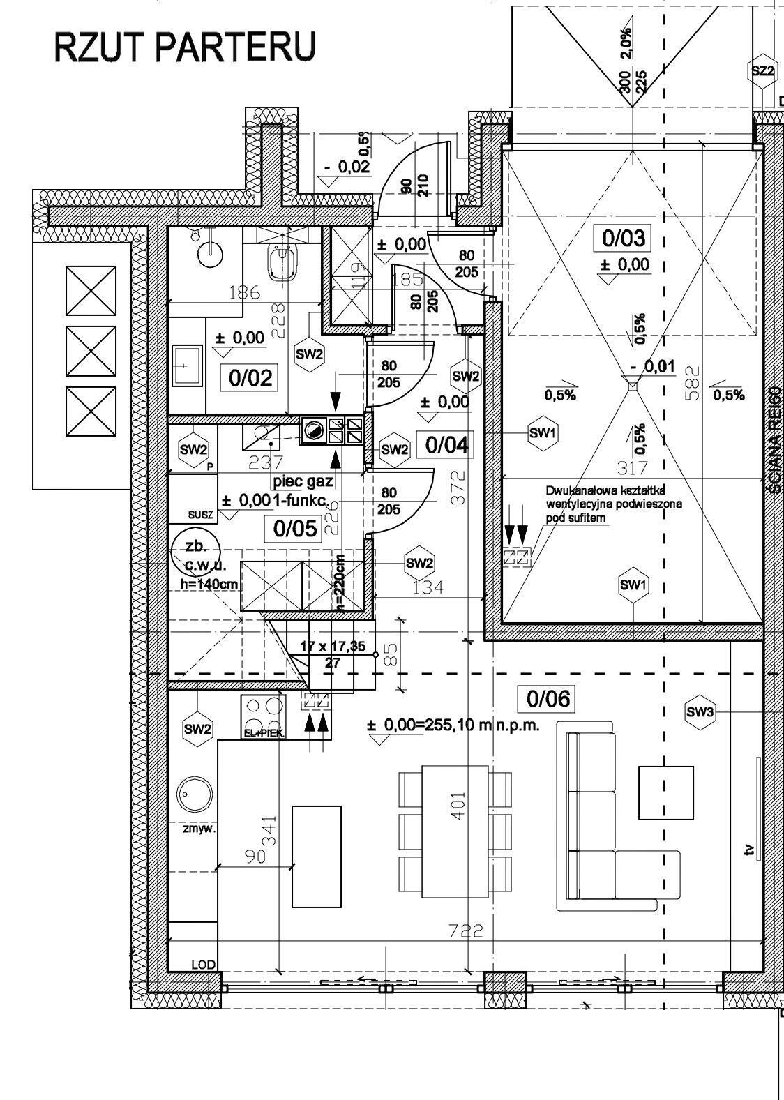 - garaż 18,55m2, salon z kuchnią 26,82m2, pomieszczenia gospodarczego 4,43m2, łazienka z WC4,75m2, komunikacja 6,72m2, wiatrołap 2,25m2,